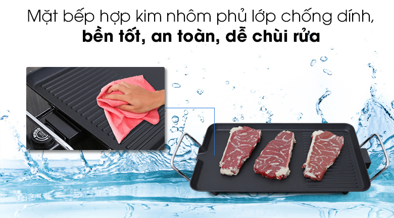 • Mặt bếp bằng hợp kim nhôm, phủ lớp chống dính an toàn, dày bền.