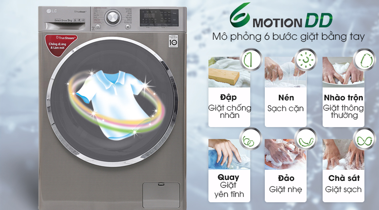 - Công nghệ giặt 6 Motion DD – mô phỏng giống như thao tác giặt đồ bằng tay.